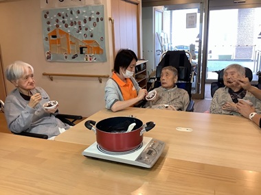 甘~いお汁粉😋 投稿公開日:2025年10月14日 本日は、寒くなってきて甘いものが食べたいと要望があった為、職員が【お汁粉】を準備し召し上がっていただきました(^^)/~~~ とろっとした餡子に餅の代わりにマシュマロを入れアクセントをつけてみました😜 食事量が落ちてきている入居者の方も口の開きが良く「もっと頂戴」「おかわりほしい」と話され、あっという間に鍋が空になってしまいました😱 今後も、甘いものを召し上がれる機会を多く作り、冬にむけての健康管理を行ってまいります<(_ _)> 文責:佐藤 その他の記事を読む 前の投稿脳トレ&体操💪
